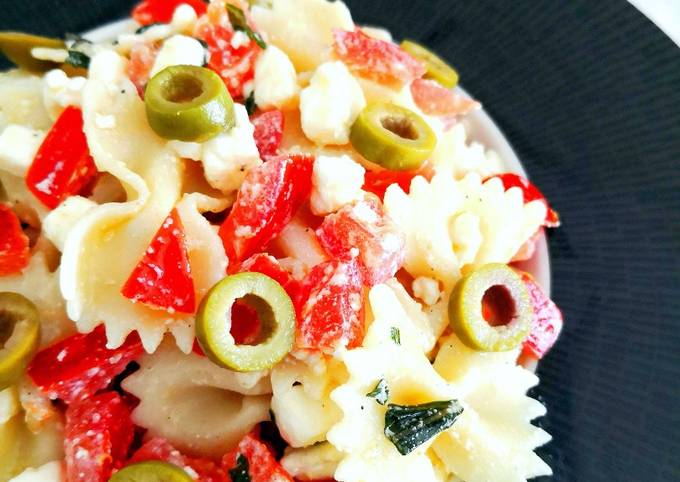 - Cuire les pâtes et laisser refroidir complètement afin que toute l'eau sèche. Laver et couper les tomates en petits morceaux en enlevant la pulpe. Couper la feta et les olives, ciseler le basilic et ajouter aux tomates, ansi que l'huile d'olive, un peu d'ail en poudre et du sel si nécessaire. Mélanger le tout avec les pâtes et placer au frais au moins 1 heure..