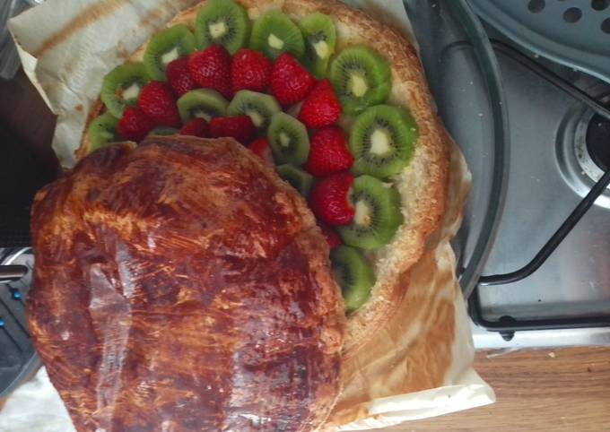 - Une fois refroidi, séparer délicatement la pâte feuilletée du dessus, recouvrir la frangipane de fraises et kiwi épluchés et coupés.