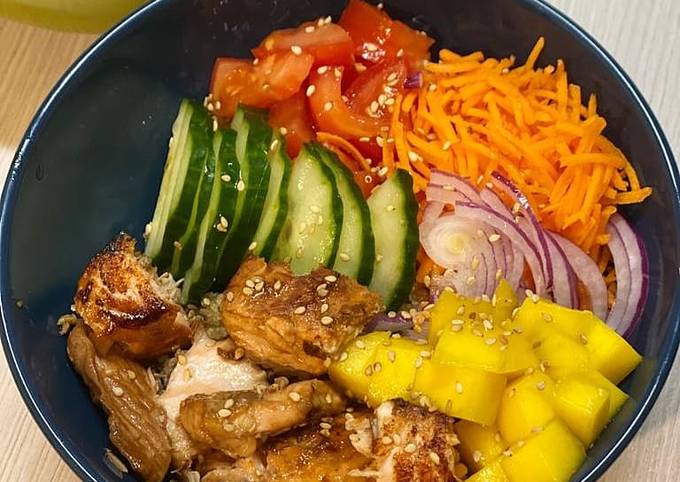 - Dressage : dans le bol mettre du quinoa sur tout le fond. Ajouter chaque ingrédients dans son coin. Déposer les morceaux de saumon. Faire couler un filet d'huile d'avocat et parsemer de graines de sésame..